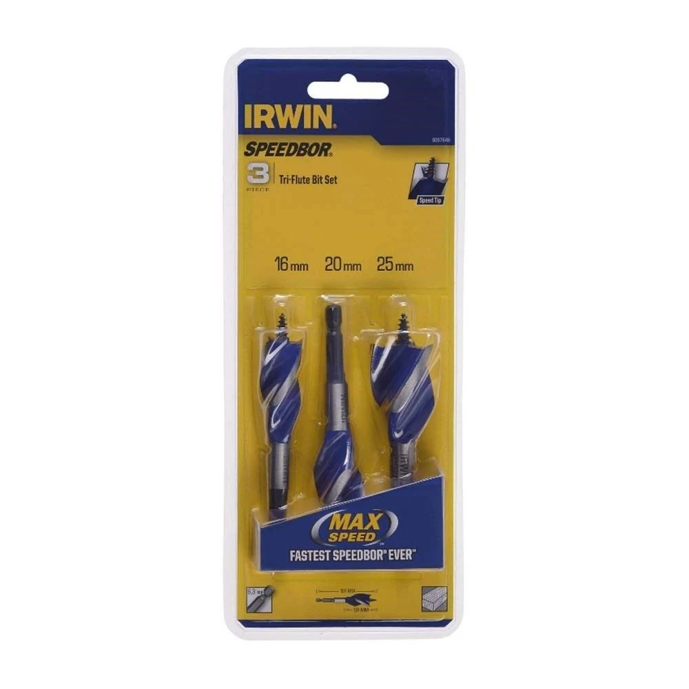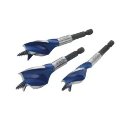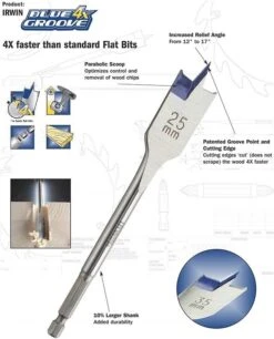 This blue groove flat drill bit set from Irwin uses a patented design for the groove point and cutting edge. The cutting edges cut the timber 4 times faster than standard spade bits, without scraping. The parabolic scoop optimises control and the removal of wood chips.